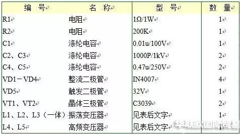 元器件清單見下表。