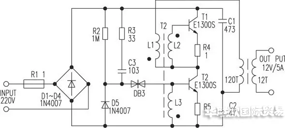 電路正常工作時(shí),A點(diǎn)工作電壓約為215V,B點(diǎn)約為108V,C點(diǎn)約為10V,D點(diǎn)約為25V。如果不振蕩,檢查VT1、VT2及L1、L2、L3的相位是否正常(交換L3的兩根接線即可)。改變L5的匝數(shù)可改變輸出電壓。