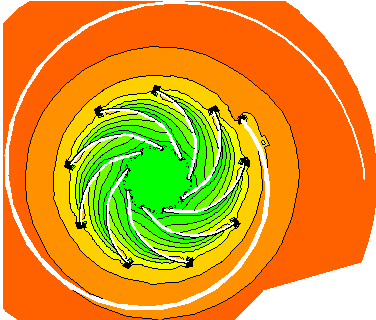 開泵后,泵軸帶動葉輪一起高速旋轉(zhuǎn)產(chǎn)生離心力。液體在此作用下,從葉輪中心被拋向葉輪外周,壓力增高,并以很高的速度(15-25 m/s)流入泵殼。
