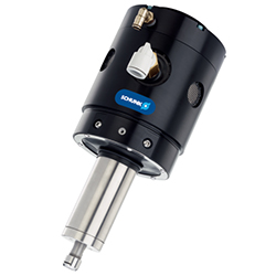 ①通過(guò)扭矩最大為65,000轉(zhuǎn)/分(取決于模塊尺寸)的氣動(dòng)主軸進(jìn)行裝置傳動(dòng)。主軸可旋轉(zhuǎn)安裝,以保持整個(gè)機(jī)加工輪廓的公差。刀頭處的最大行程為±9 mm。移動(dòng)(振動(dòng))主軸需要力(硬度)。其受第二個(gè)空氣接口控制。根據(jù)壓力不同,作用于銑削表面的力為3.1 N至89 N。